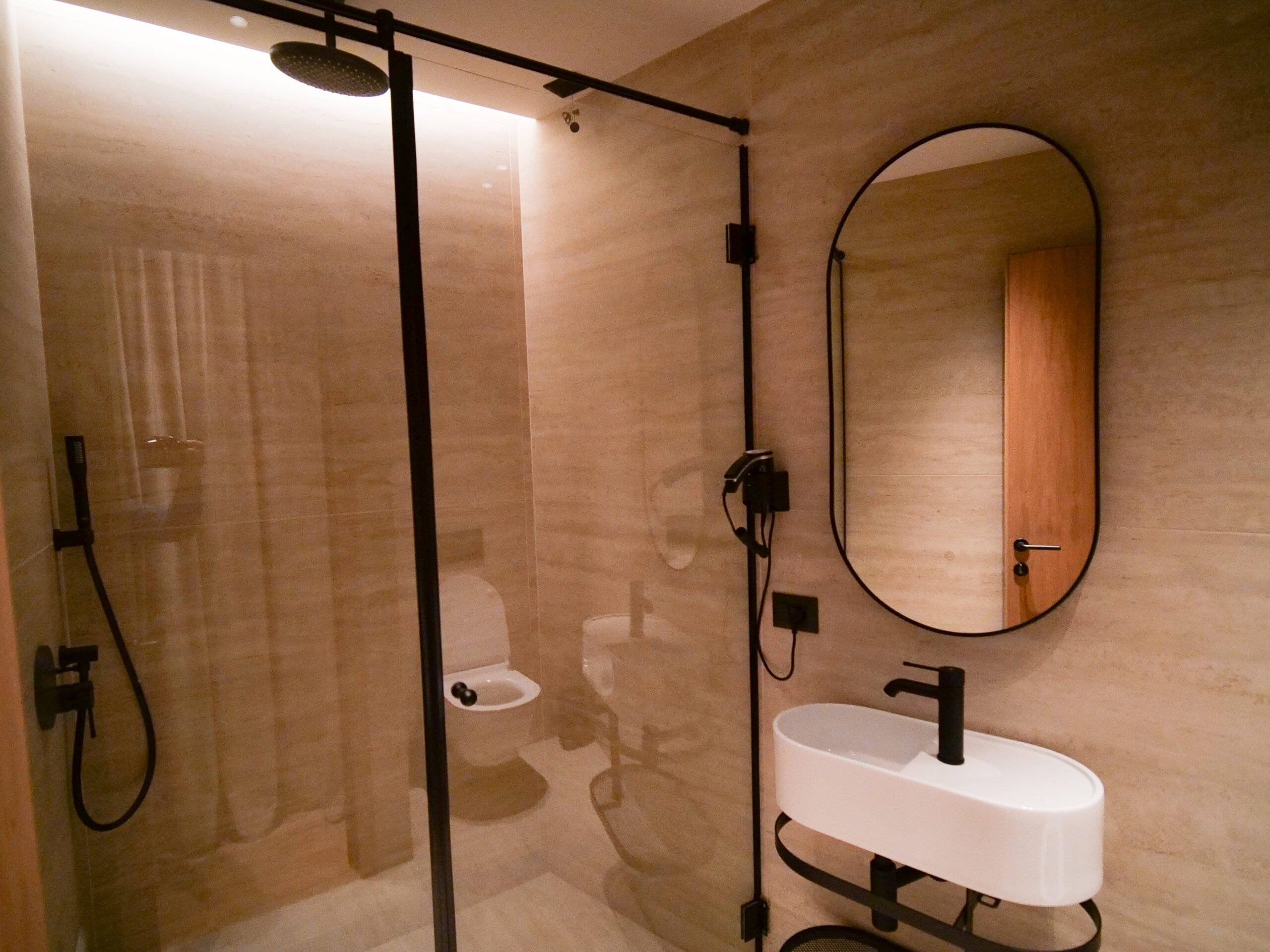 Your private bathroom is a space of pure utility and comfort, equipped with a modern shower, professional hairdryer, and soft slippers. Complimentary toiletries and fresh towels are provided to enhance your stay.